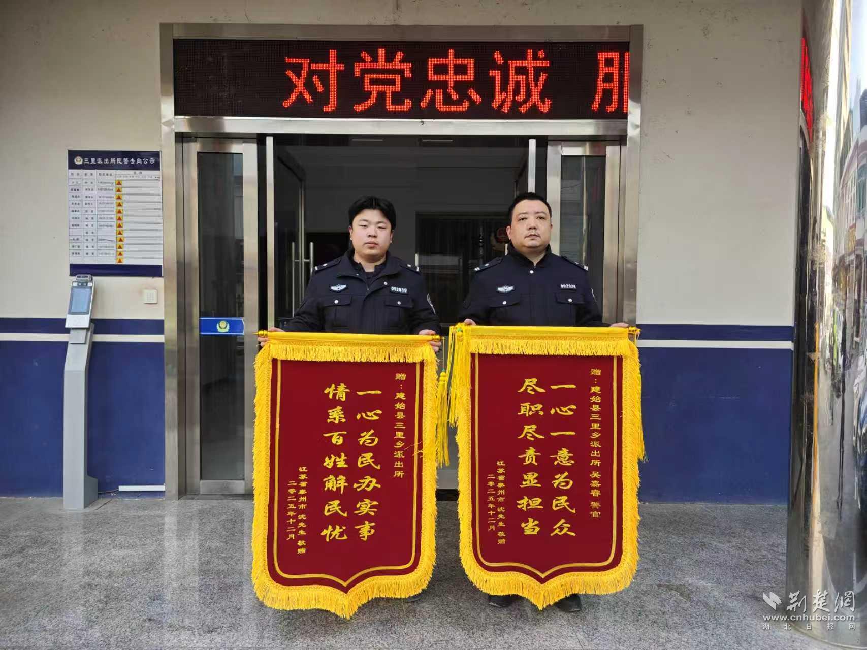 荆楚网(湖北日报网)讯(通讯员 谢露)1月15日,建始县公安局三里派出所收到一份从江苏泰州寄来的快递。民警拆开包裹,两面印着“情系百姓解民忧 一心为民办实事”“尽职尽责显担当 一心一意为民众”的锦旗赫然出现,随附的便签上写道:“感谢三里派出所的警官们,帮我母亲圆了三十年的‘寻籍梦’。”这份跨越千里的谢意,让整个派出所洋溢着暖意。