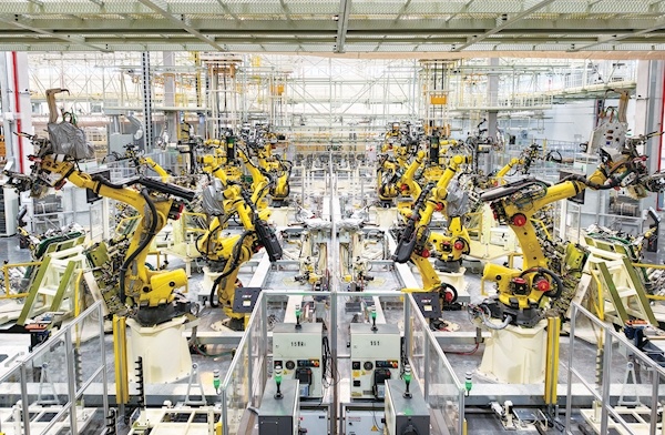 东风商用车D600智慧工厂内机器人协同作业。记者张启国摄