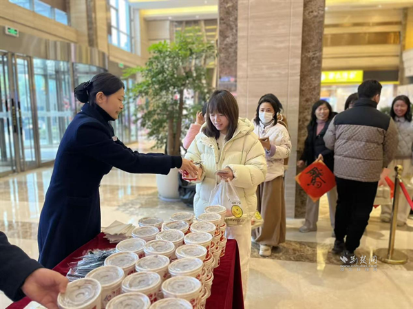 正午时分,另一旁的粥品区飘出浓郁香气。12点整,工作人员和楼宇党建指导员准时为排队职工赠出腊八粥,糯米的绵软、红豆的香甜、红枣的醇厚在碗中交融,“一碗香甜软糯,暖胃更暖心”的贴心叮咛格外温情。刚领到粥的职工小孙捧着热碗笑道:“这粥熬得特别地道,喝下去全身都暖了,感觉工作的疲惫都消了大半。”