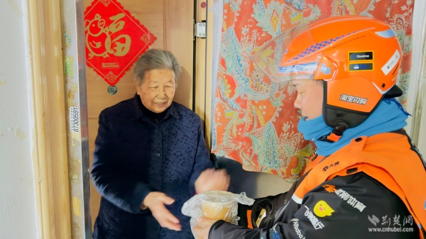 温暖派送覆盖多元群体。在户外劳动者驿站,环卫工人、快递外卖骑手从志愿者手中接过热粥;社区还链接武汉市第三医院资源,为户外工作者提供健康咨询。几位外卖骑手主动化身“公益骑手”,与党员志愿者一同将暖心粥品送至“鹤耋安”高龄独居老人家中。党员志愿者还走访了周边商户、残疾人家庭及退役军人家属,并在社区设点邀请居民共享温情。一碗粥,沿着党员和志愿者的温暖足迹,流入社区每个角落。