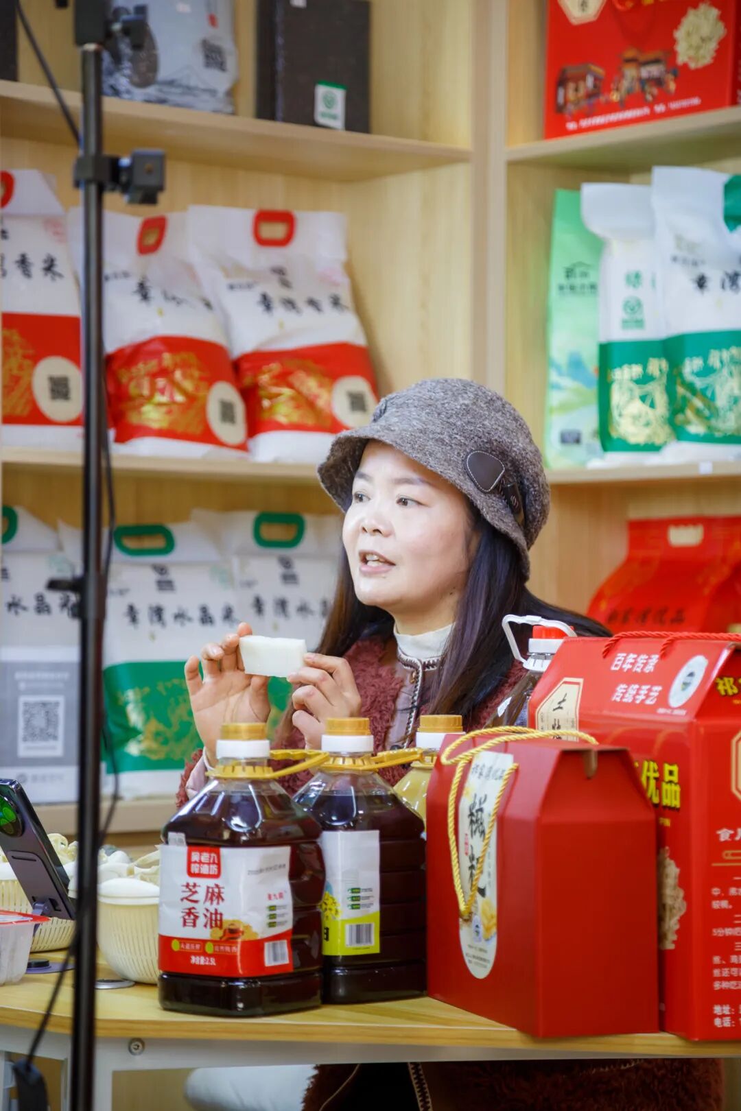 直播基地总面积达300㎡,是街道精心打造的综合性农业服务窗口,依托武汉云上耕农业发展有限公司搭建的优质供应链,汇聚了祁家湾及周边十余家家庭农场、合作社的二十余种特色产品——鲜榨菜籽油、优质大米等粮油调味,纯散养土鸡蛋、手工豆丝、风干鱼等特色农产品,应有尽有。