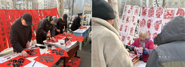 同一时间,在四美塘社区,大红的春联纸、精致的剪纸作品与浓郁的墨香交织,勾勒出吉祥喜庆的新春图景。武昌区社区教育学院杨园街分校的教师和学员们布置了书法创作区、剪纸展示区,吸引众多居民驻足观赏。在书法创作区,居民主动参与书写体验,在老师的指导下亲手描绘新春祝福。在剪纸区,精美的作品整齐陈列,居民们登记后即可领取,将这份独特的新春祝福带回家。