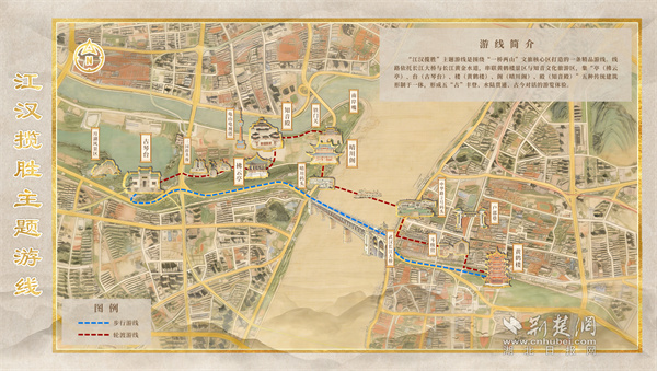 “江汉揽胜”主题游线以百年轮渡为纽带,串联起5A级黄鹤楼景区与4A级知音文化旅游区,集亭、台、楼、阁、殿五种传统建筑形制于一体,生动展现武汉“半城山水半城诗”的城市意象。游线自黄鹤楼启程,途经斗级营、户部巷,乘轮渡横渡长江,观赏晴川灯会,最终探访知音殿、游览古琴台,集萃武汉长江两岸自然风光、文化地标与城市烟火气,是自然与人文、传统与现代交融的精品线路。