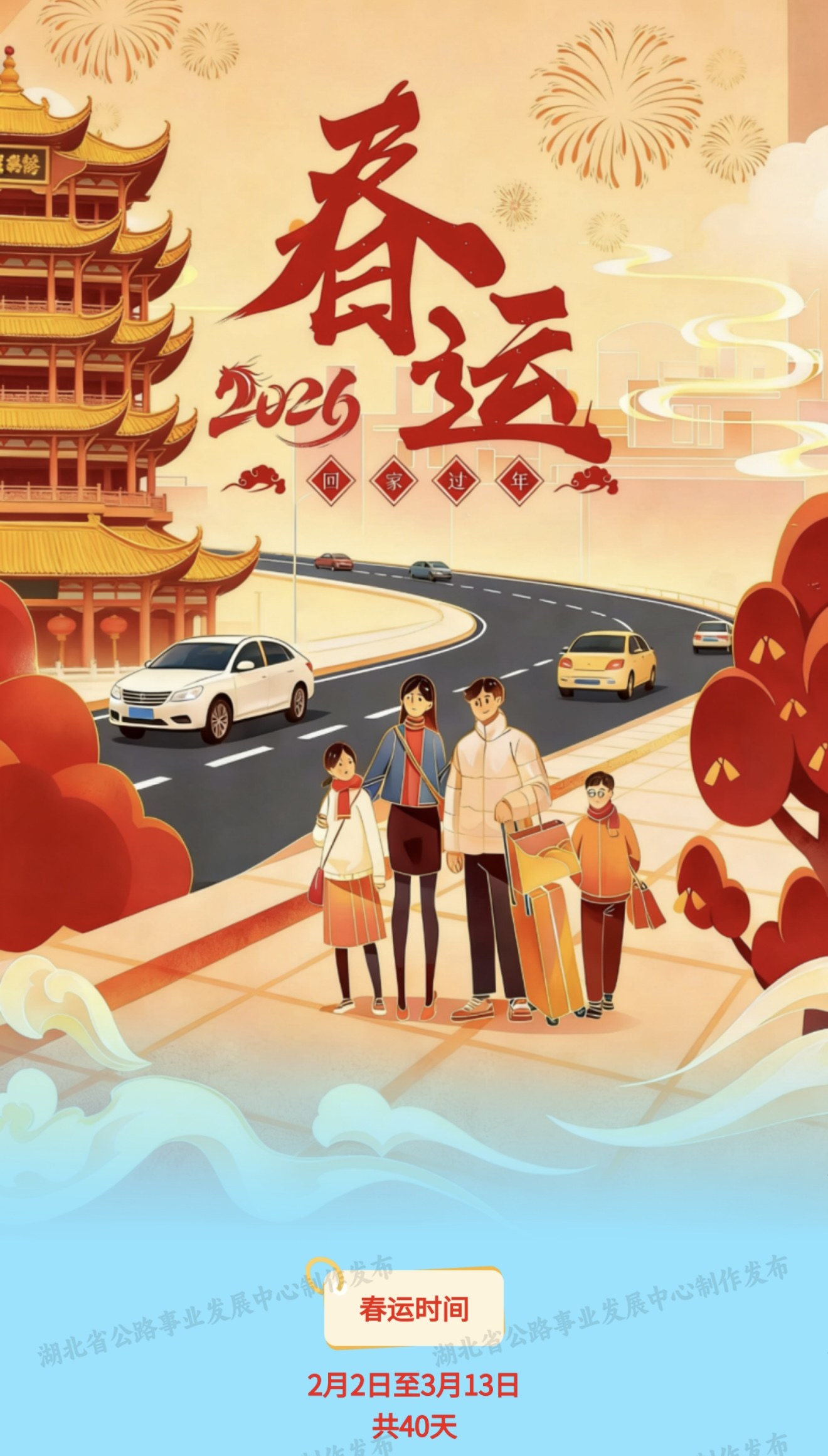 第二阶段:春运中期(2月15日至2月23日,共9天,春节期间)。春节期间,收费公路对小型客车实行免收通行费政策,流量以小型客车探亲出行为主,货运车流主动避峰,客车占比约为97%,货车占比约为3%,路网流量特征呈前低后高趋势。其中,2月15日、16日(腊月廿八、除夕),全省干线公路流量相对平稳;2月17日至19日(正月初一至初三),路网流量回暖上升,以武汉及各市州为中心向周边县市发散;2月20日至23日(正月初四至初七),预计返程车流相对集中,各县市车流向重点城市汇聚,潮汐特征明显。此阶段是春运期间日均流量最大阶段,并形成春运期间第一波流量高峰,预判峰值日出现在2月22日(正月初六)。