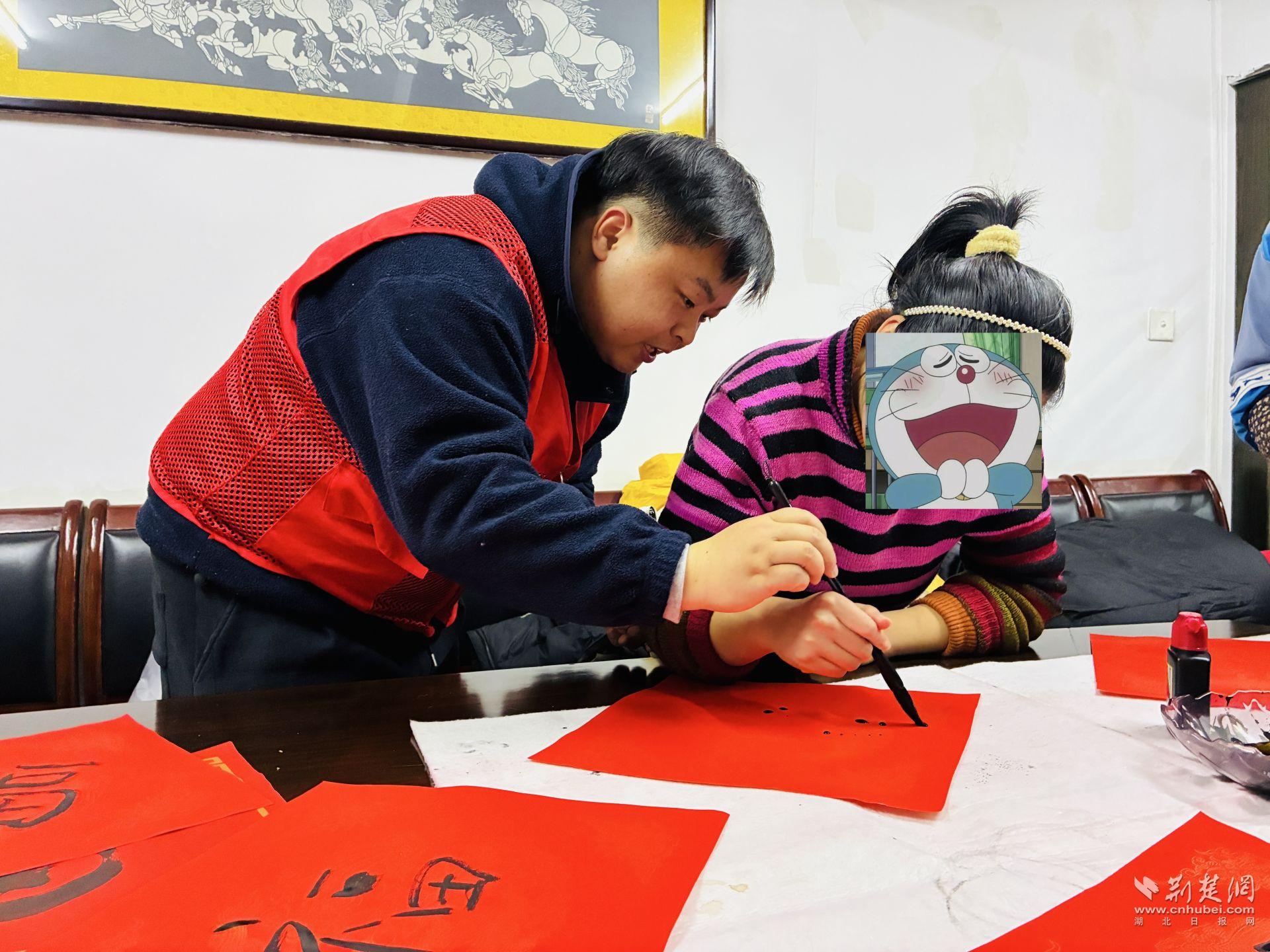 活动现场还设置了春联书写互动区。书法老师从握笔姿势、用笔力度讲起,耐心示范基础笔法,并根据每个人的情况进行指导。笔墨铺展间,一副副春联逐渐成形,内容朴实真切,寄托着对新一年的期望。