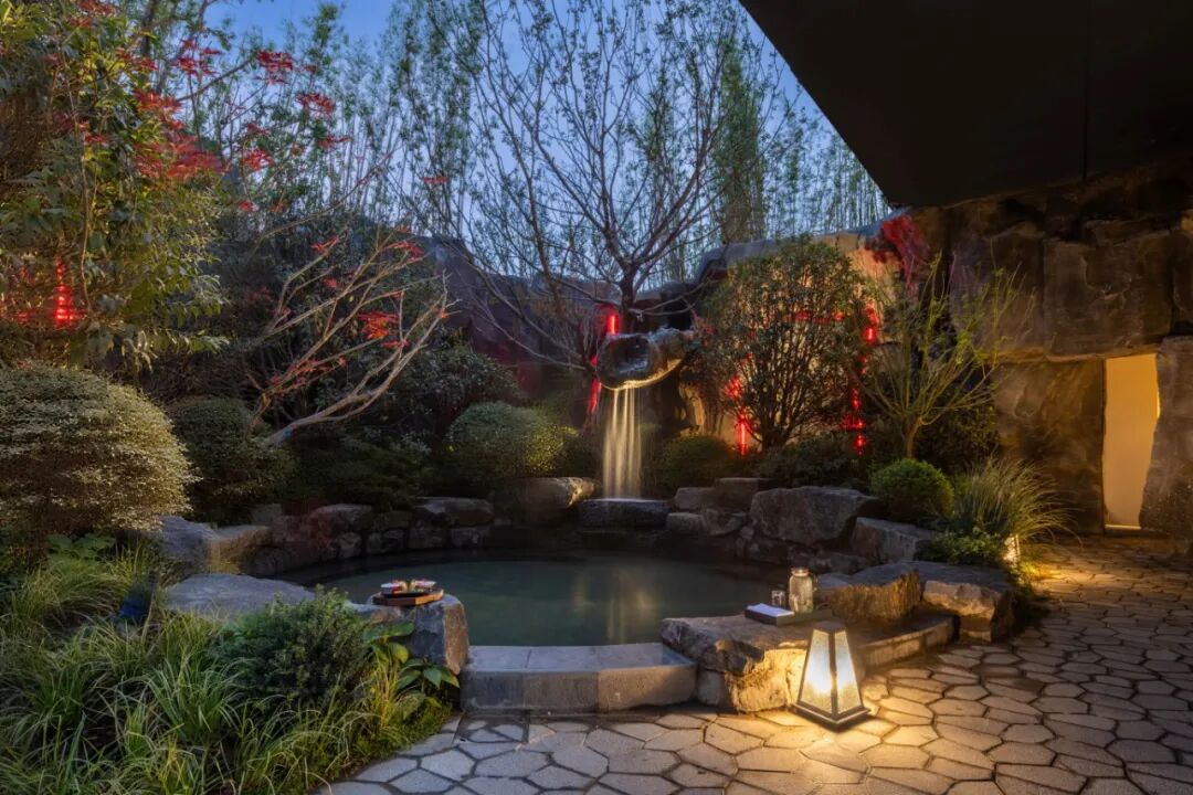 140间客房均自带私汤院落,庭院内草木葱茏,私密性极佳。民宿共设29处室内外汤池,分别主打康养、美容、舒缓等不同功效,搭配中草药包,养生与舒适兼备。