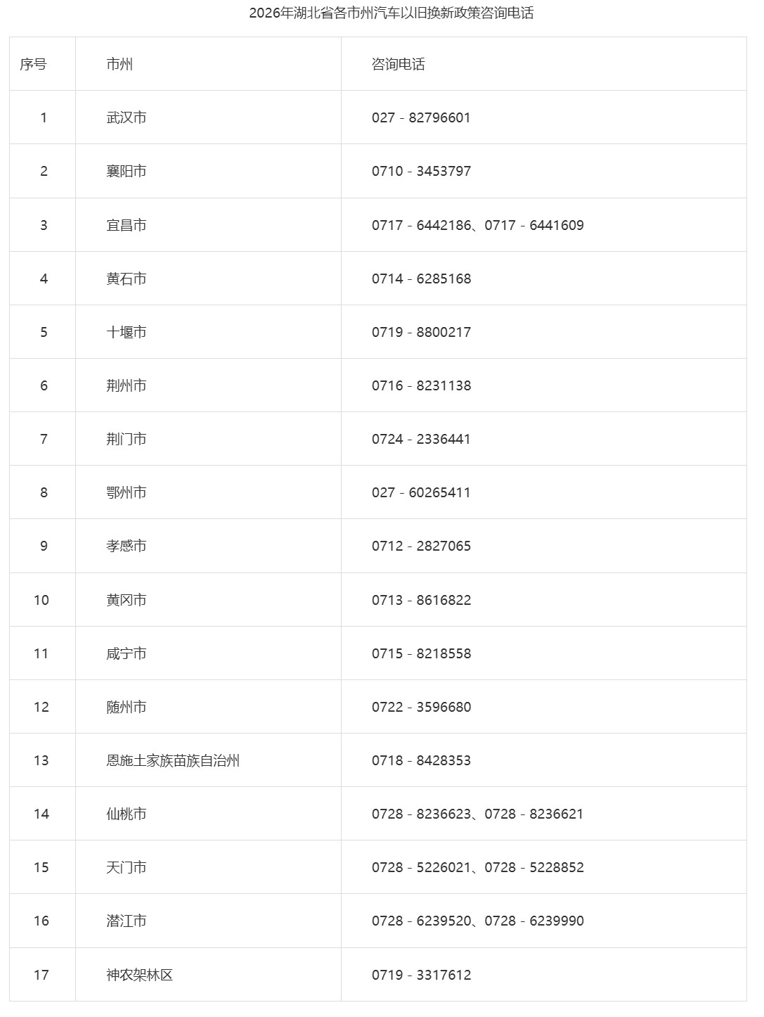 答:可以通过各地设立的汽车以旧换新电话进行咨询。咨询电话可通过“汽车以旧换新”小程序或湖北省汽车置换更新服务平台查询。