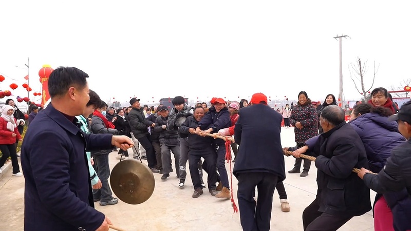 文化广场内,写春联摊位前墨香袅袅、人气十足,本地书法能人挥毫泼墨,一副副寓意吉祥的春联和“福”字跃然纸上,免费赠予到场乡亲。村民们或驻足围观、轻声喝彩,或排队求联、满载而归,红彤彤的联纸映红了一张张幸福的笑脸。不远处的趣味互动区同样热闹非凡,投壶纳福、家庭套圈等项目前人头攒动,大人小孩轮番上阵,欢呼声、喝彩声此起彼伏;激动人心的拔河比赛更是将现场气氛推向高潮,参赛村民们攥紧长绳、齐心协力,围观群众的呐喊助威声震天动地,尽显乡村邻里的团结与活力。