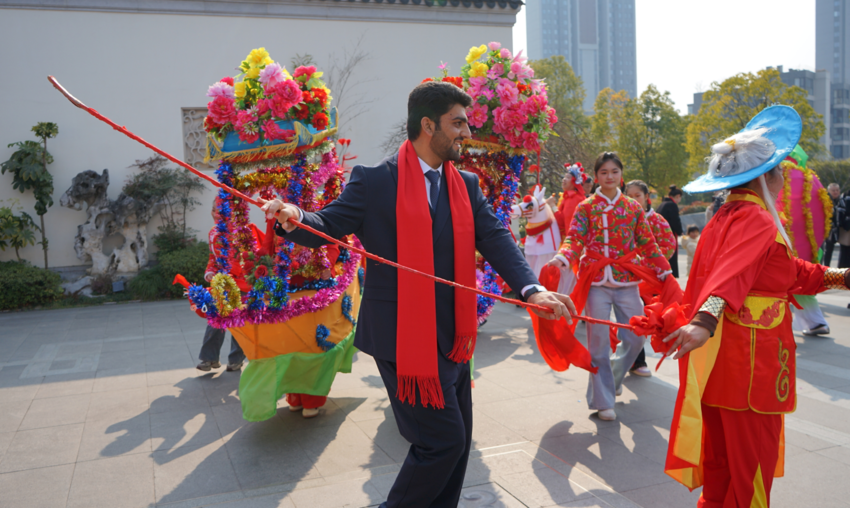 活动当天,现场氛围热烈喜庆,民俗展演与新春集会接连上演,为外籍友人带来沉浸式新春体验。十堰本地民俗表演团队的划旱船表演灵动欢快,工作人员邀外籍友人参与互动,手把手指导动作,让大家在欢声笑语中感受中国年的热闹温情。