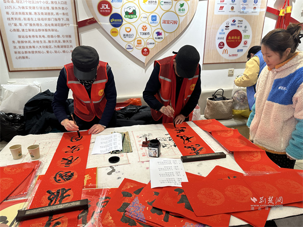 活动现场张灯结彩,福字、春联相映成趣,处处洋溢着喜庆祥和的节日气息。书法志愿者现场挥毫泼墨,一笔一画写下新春祝福,一幅幅寓意吉祥的春联与福字深受大家喜爱,户外劳动者们驻足欣赏、挑选心仪对联,在墨香中提前感受春节的仪式感。