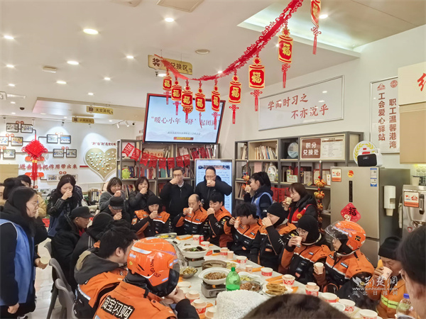 荆楚网(湖北日报网)讯(通讯员 赵坤 童霞)2月10日农历小年,武昌区南湖街道工会联合中央花园社区、宝安社区在南湖街新就业群体服务工会驿站开展“暖心小年,‘驿’起团圆”活动,邀请外卖小哥、快递员、环卫工人等20余名户外劳动者欢聚一堂,写福字、玩游戏、吃团圆宴,在欢声笑语中,感受工会“娘家人”的温暖。