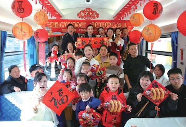 车窗将风景甩在身后,列车“春晚”把年味拉到眼前。活动高潮时,悠扬旋律中,旅客们纷纷起身合唱,歌声、笑声、欢乐声荡漾在整列车厢。列车员还精心准备了马年专属“福”字贴和玩偶赠予旅客,让这场流动盛宴更添温情。在场旅客纷纷表示,列车“春晚”不仅是一场文艺演出,更是一次充满年味的团圆之旅,让回家之路倍感温暖。