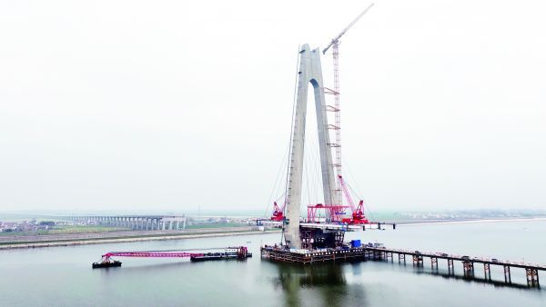 2月25日,在武荆宜高速汉江特大桥施工现场,主塔高耸矗立、雄踞汉江两岸,气势恢宏、蔚为壮观(如图)。