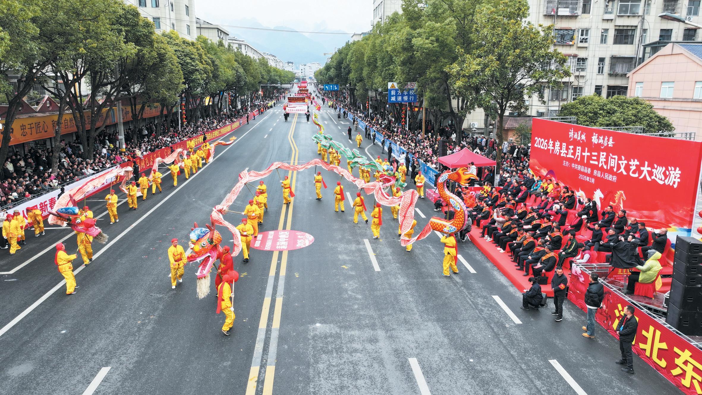3月1日上午,在元宵佳节来临之际,以“诗酒美城 福满房县”为主题的2026年房县正月十三民间文艺大巡游在唐城广场拉开帷幕。由2000余名演职人员组成的46个特色方阵,沿该县县城主干道一路载歌载舞、踏歌前行,为市民游客献上了一场精彩的文化盛宴。