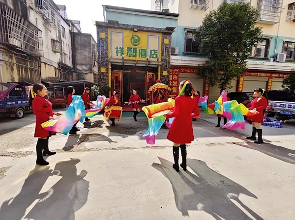 曾都经济开发区两水沟社区组织社区凤婉舞蹈队走进商业街区,开展了“我们的节日·元宵节”主题文化活动。(通讯员陈发维摄)