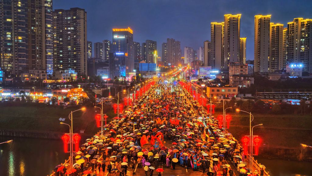 雨润省界桥,灯暖湘鄂情。3月2日,元宵节前夕,连接湖北来凤与湖南龙山的湘鄂情大桥上,雨丝纷飞却暖意融融,两省群众冒雨相聚,共赴“龙凤元宵民间灯会”这场跨越省界的民俗盛宴,用非遗灯舞传递邻里深情,共庆元宵佳节。
