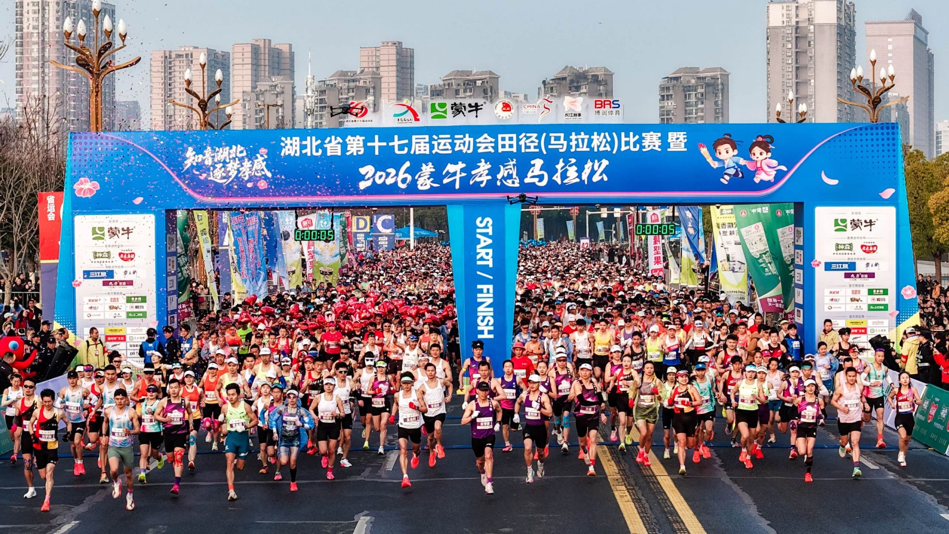 荆楚网(湖北日报网)讯(记者 张戈、舒俊杰 通讯员 李林、林立)3月8日,湖北省第十七届运动会田径(马拉松)比赛暨2026蒙牛孝感马拉松在孝感市文化中心鸣枪起跑,来自全国各地的16000名选手,在“中华孝文化名城”的晨曦中踏风而行,在奔跑中书写“知音湖北,逐梦孝感”的省运篇章,全面展现“孝爱之城,甜蜜之地”的独特城市气质。
