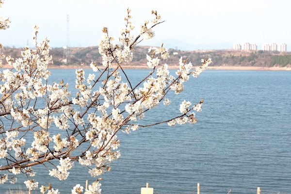 江流东去,花影不动,郧阳区汉江河边的樱桃花与江水上演动与静的交织。