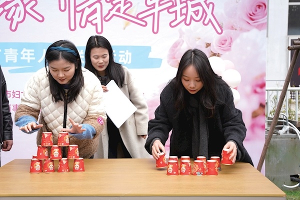 随后,创意扭扭花团扇 DIY、看图猜词、叠杯子等互动环节轮番上阵,青年们男女搭配、协作配合,在轻松互动中增进了解、加深默契。