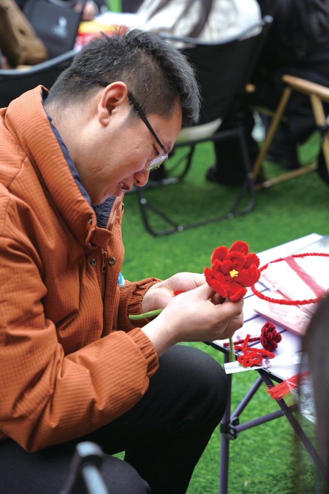 一名男生成功制作一朵“鲜花”。