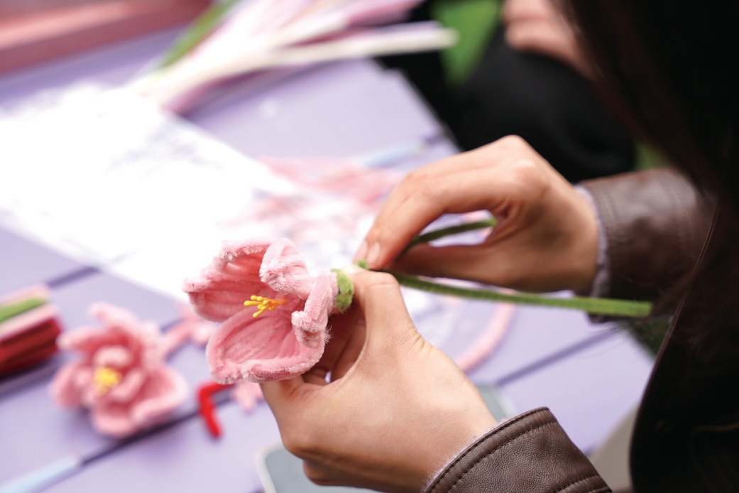 “花”现美好·三八创意手作现场,扭扭棒、空白团扇、装饰配件一应俱全。大家随机组队,一边交流创作思路,一边动手弯折、粘贴、装饰,红色、粉色、黄色的花朵在指尖绽放,普通的团扇在协作中变得精致别致。创作完成后,多组嘉宾登台展示作品,巧思满满的手作赢得阵阵掌声,大家合影留念,定格这份专属美好。
