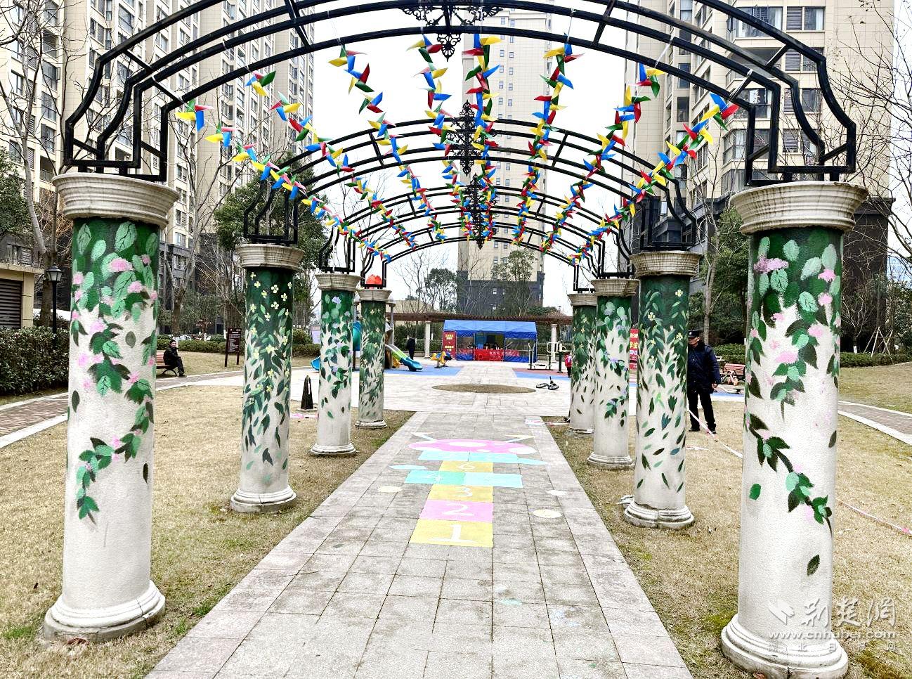 傍晚时分,都市华府小区的天使风车长廊里,孩子们在彩绘间嬉戏,欢声笑语回荡在小区的上空。