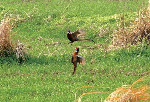 两只环颈雉在田间嬉戏追逐。