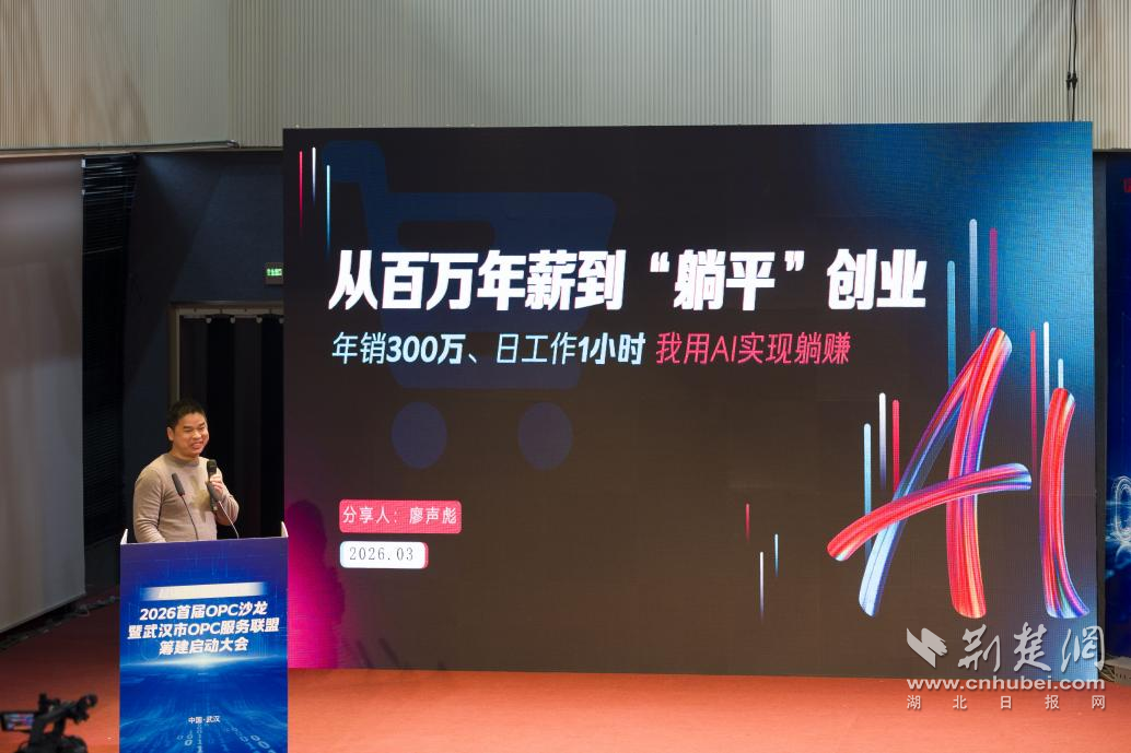 活动现场,创业者分享环节成为一大亮点。36岁的创业者廖声彪带着自己的创业故事登台,言语朴实却充满力量。他向现场观众分享了自己的创业历程:从拥有百万年薪的职场人,毅然转型选择“躺平式”创业,如今他的项目年销售额已达300万,每天仅需工作1小时,凭借AI技术成功实现了“躺赚”的创业愿景。此外,他还现场表示,下半年将从杭州回到武汉,开启一人公司的创业模式,扎根江城这片科创沃土,为武汉OPC产业发展贡献力量。