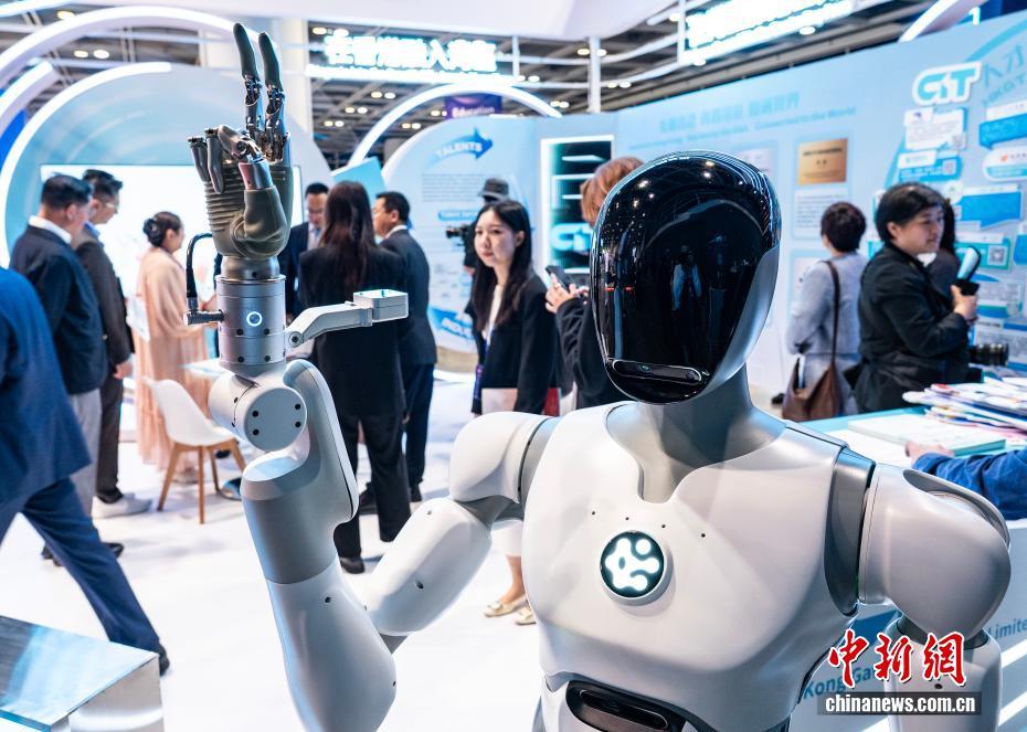 图为“机遇汇人才博览展”上,一家科技企业用人形机器人吸引来访者。中新网记者 侯宇 摄