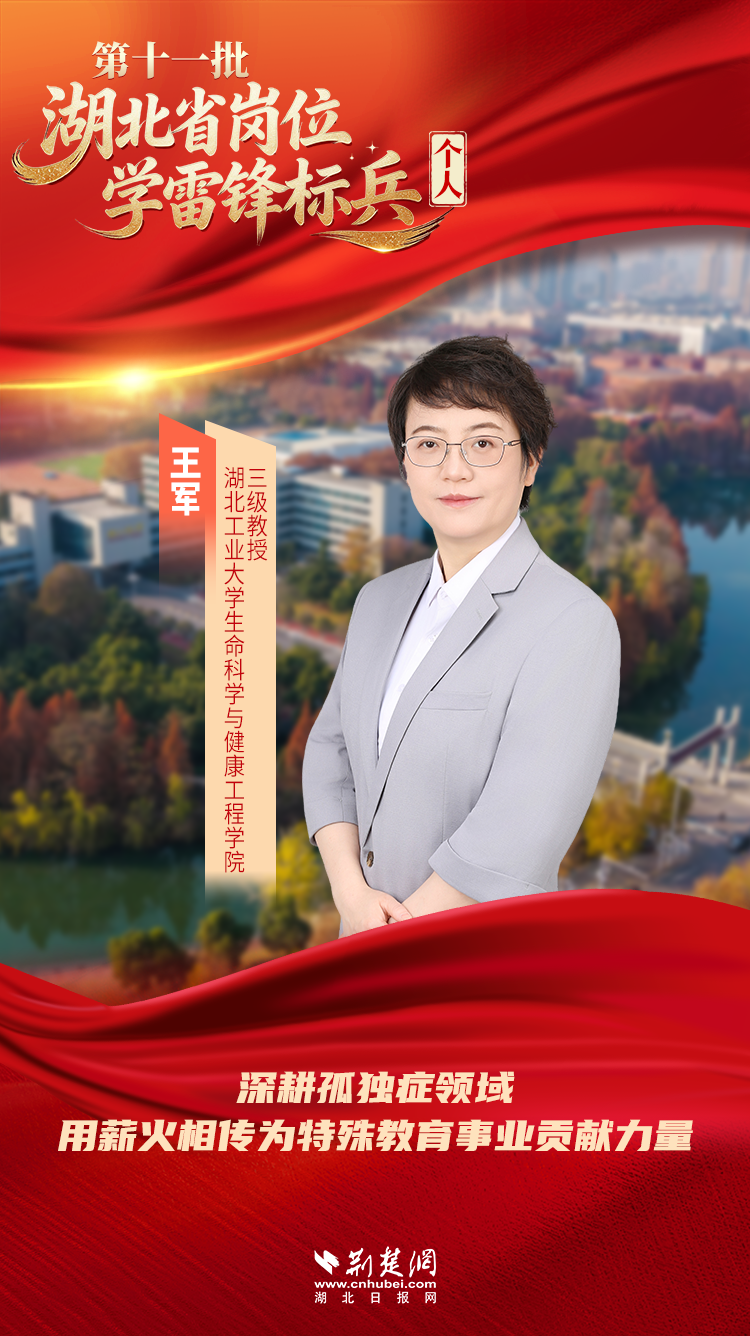 王军教授深耕孤独症领域,将“科学家精神”与“雷锋精神”深度融合,以仁心惠民生、以匠心育新人,用大爱诠释新时代高校教师的责任担当。近日,王军被省委宣传部选树为第十一批湖北省岗位学雷锋标兵。