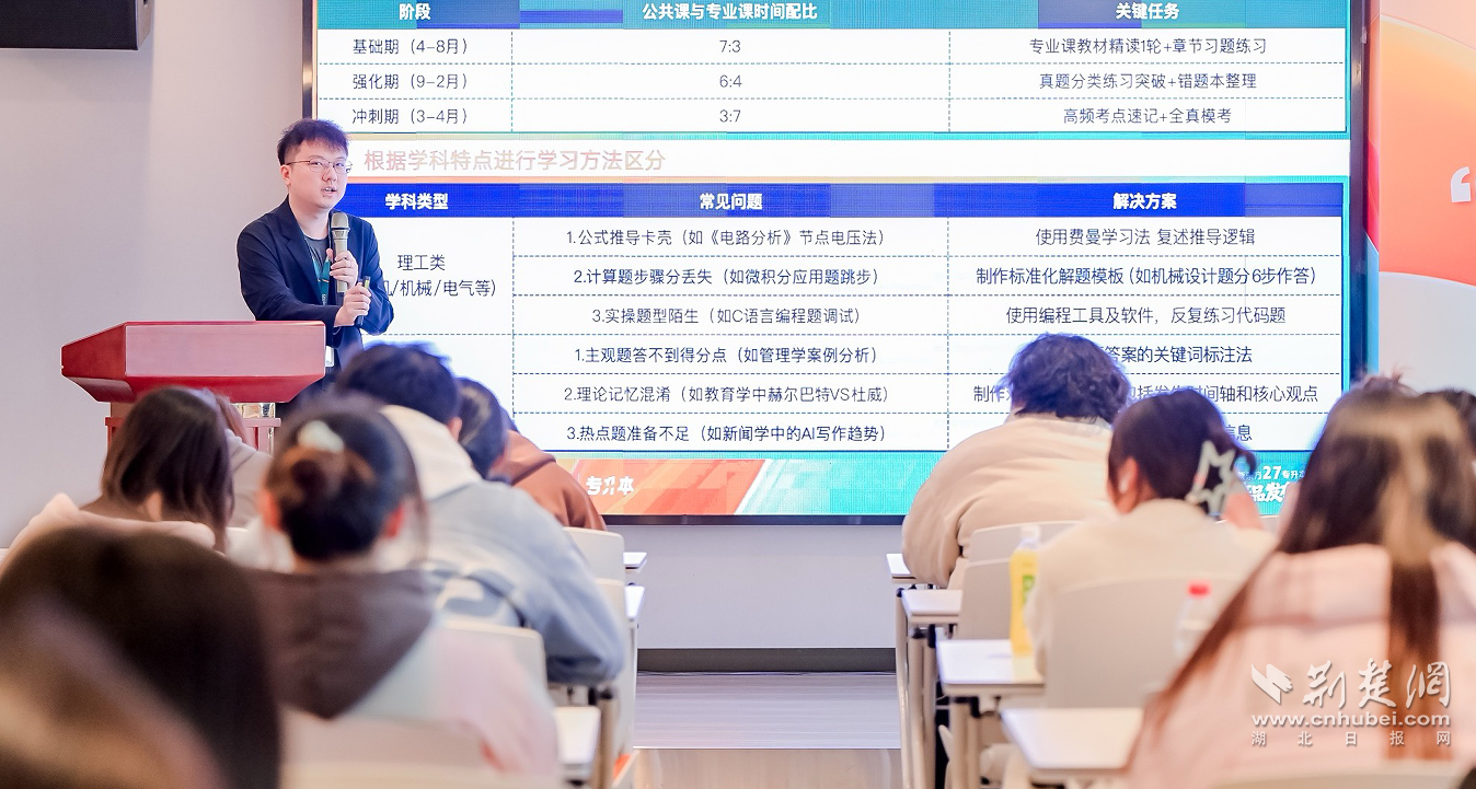 备考先知情,方能赢在起点。发布会上,教学负责人胡诚林,围绕湖北省专升本公共课考情回顾及2027备考规划展开详细分享。他重点拆解了《大学英语》这一核心公共课的考试要求、题型迭代规律及难度变化趋势,针对考生最关心的词汇积累、语法掌握、阅读理解、书面写作四大模块,提供了可落地、可执行的备考策略。从词汇记忆的高效方法、语法考点的重点突破,到阅读技巧的精准运用、写作能力的分层提升,胡诚林老师进行了全方位、系统化的解析,为考生搭建起清晰的公共课备考框架,帮助大家精准把握备考节奏,做到游刃有余。