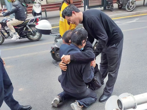 詹某春当街给父亲跪下。