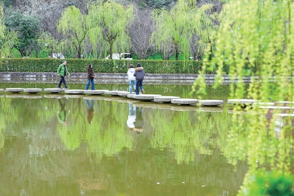 在湖北工业职业技术学院,柳树将翠色倾入水中。游步道上行人走过,与倒影构成流动的画卷。