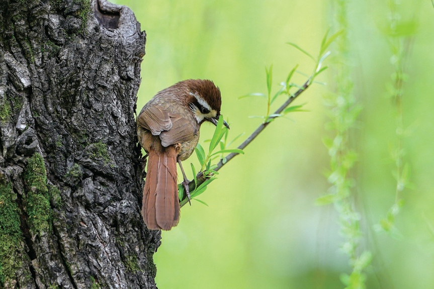 在湖北工业职业技术学院,小鸟叼着刚发芽的绿叶。