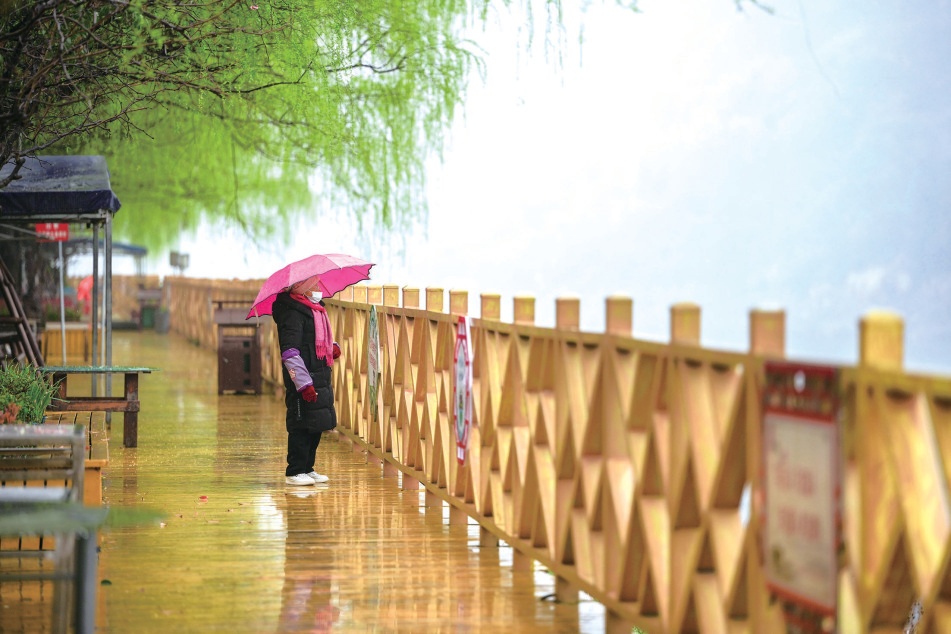 在张湾区方滩乡,烟雨朦胧中,行人正欣赏春雨美景。