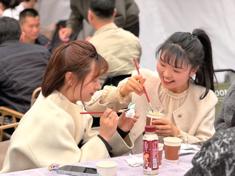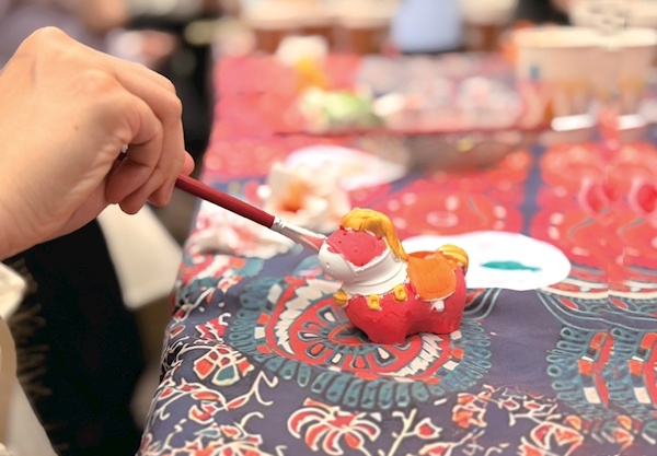 在福马彩绘 DIY环节,嘉宾们自由组队协作,每张桌案上都摆放着石膏福马、各色颜料与绘画工具。大家围坐在一起,或精心构思配色方案,或默契分工配合,男生主动帮忙调颜料、递画笔,女生细心勾勒轮廓、填充色彩,原本素净的石膏娃娃,在众人巧手下渐渐变得灵动鲜活。有的小组选用红金配色打造喜庆福马,寓意吉祥顺遂;有的小组大胆创新,以马卡龙色系勾勒萌趣福马,尽显创意巧思。30分钟限时创作结束后,各小组依次登台展示专属作品。