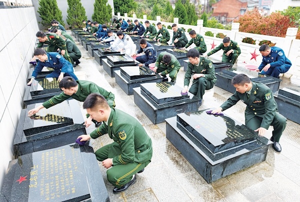 3月24日,郧阳区组织近40名春季退役老兵走进郧阳革命烈士陵园,开展清明祭奠活动,缅怀革命先烈、传承红色精神。活动现场,退役军人仔细擦拭烈士墓碑,表达对先烈的深切缅怀与崇高敬意。大家表示,将以革命先烈为榜样,保持军人的优良作风,传承红色基因,把对先烈的缅怀之情转化为干事创业的动力,为十堰经济社会发展贡献力量。记者 张建波 摄
