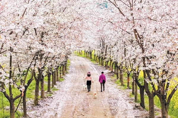 连日来,随着天气渐暖,郧阳区五峰乡迎来春日盛景。在该乡西峰村,绵延3公里的樱花路旁,一株株樱花灿烂绽放。微风拂过,花瓣随风飘落,如雪花般轻盈,构成一幅浪漫的春日画卷,吸引众多市民前来打卡拍照。该村还种植四五百棵梨树,目前也已进入开花期,洁白的梨花与樱花、油菜花相映成趣,进一步丰富了游客春季观赏体验。记者刘成臣摄