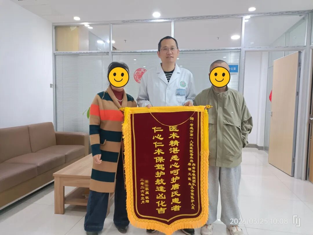 荆楚网(湖北日报网)讯(通讯员 颜惠文 吴小莉)近日,在孝感市第一人民医院普外科向青峰博士团队的精准救治下,一名因误吞鱼刺引发危重并发症的唐氏综合征患者顺利康复出院。患者家属满怀感激,专程送来锦旗致谢,这面锦旗,不仅承载着家属沉甸甸的谢意,更见证了医者无惧艰险、守护生命的仁心大爱。