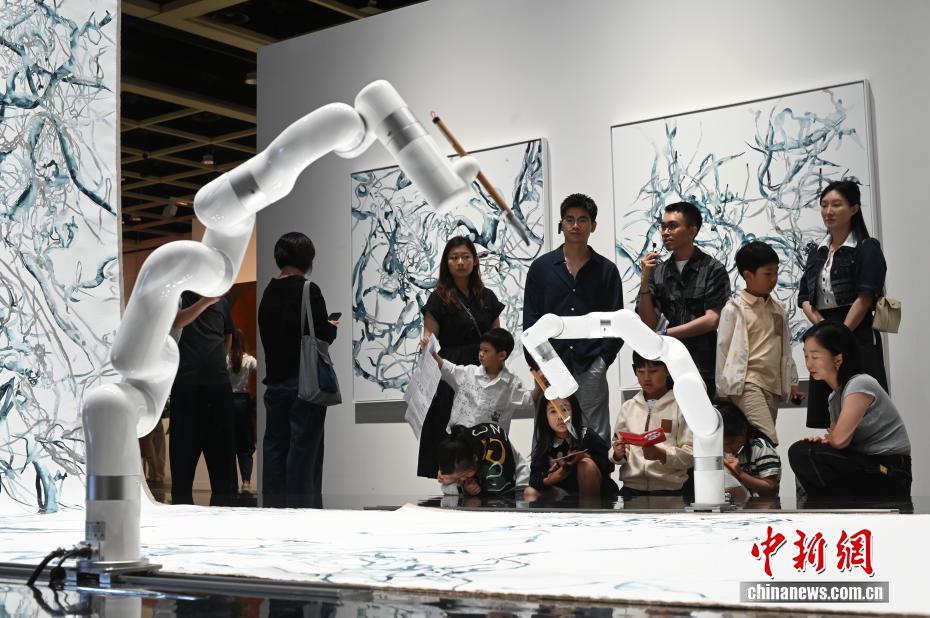 图为参观人士认真观看以机械臂绘制的艺术品。中新网记者 李志华 摄