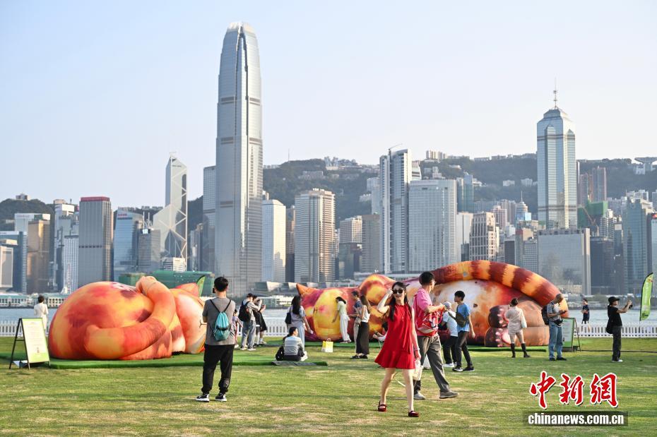 图为民众在西九文化区艺术公园草坪上欣赏维港景色与大型艺术装置“梦游喵境”。中新网记者 李志华 摄