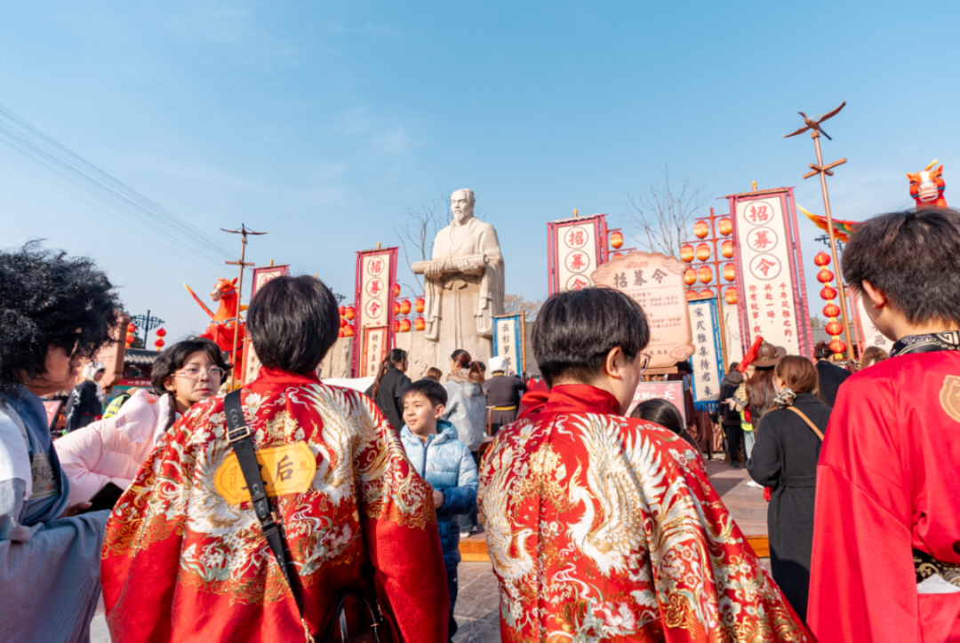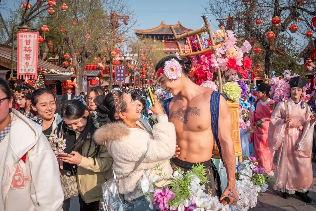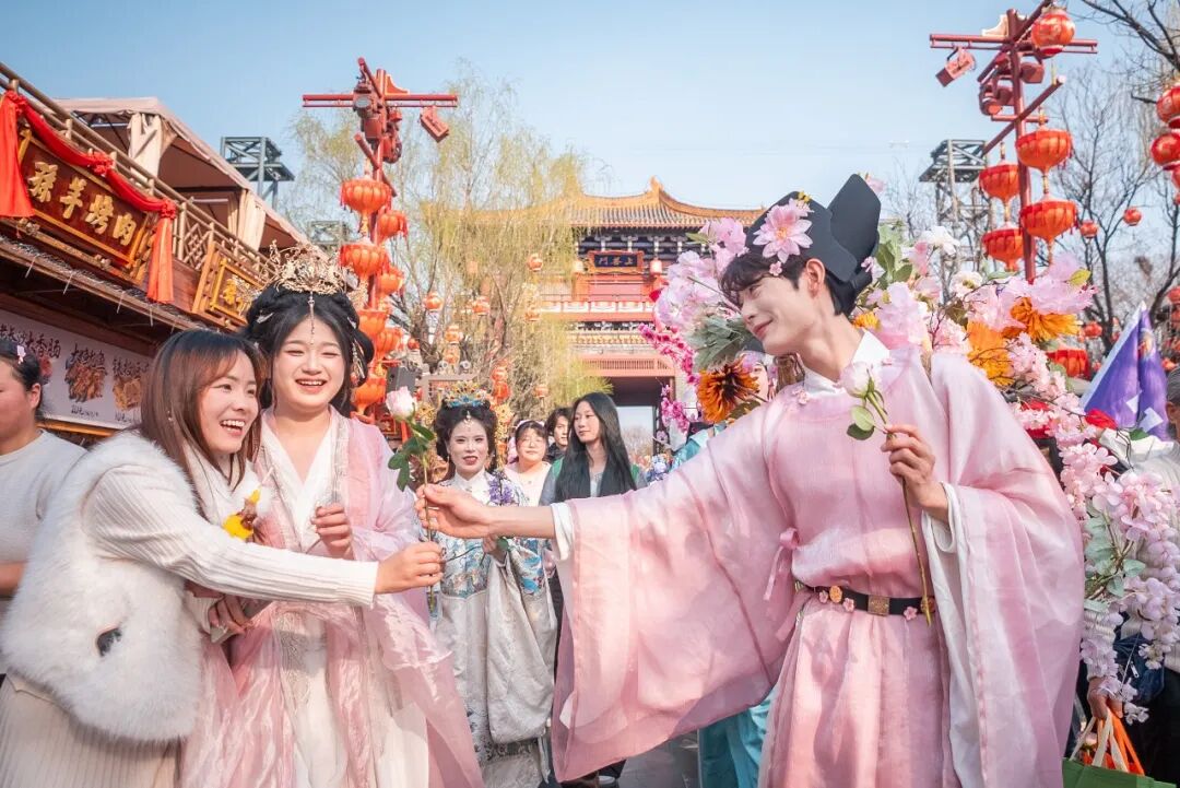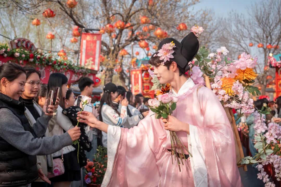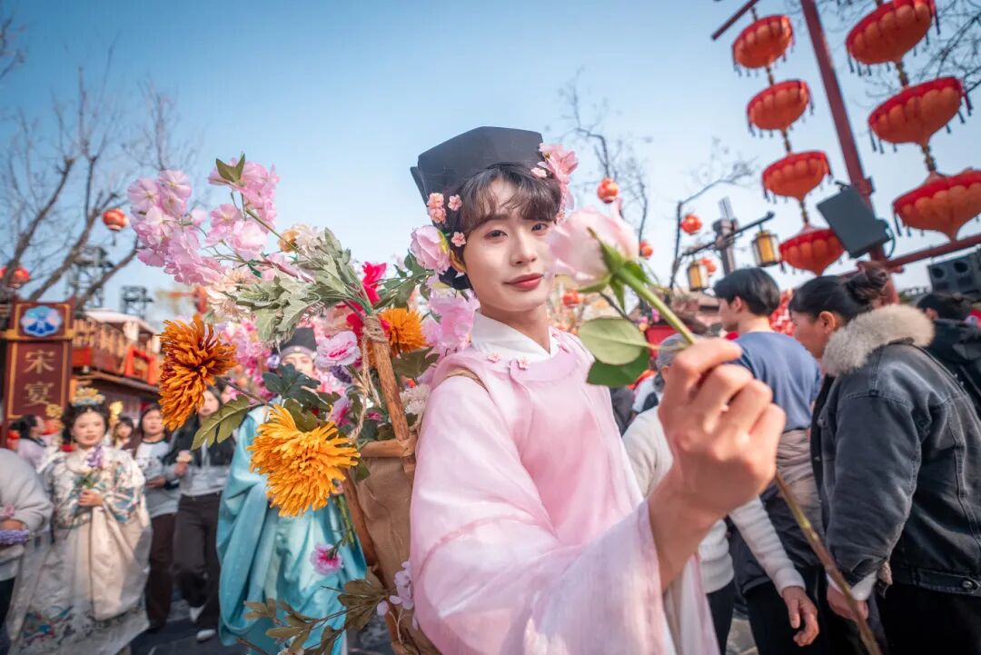 在这里,男子簪花尽显洒脱,正如欧阳修笔下“戴花持酒祝东风”的自在。宋式青衫的簪花儿郎,衣袂翩跹的簪花娘子,自清明文化广场缓缓启程,恰似《清明上河图》里的市井风雅鲜活走来,穿梭在园区各处,随机“投喂”春日惊喜!