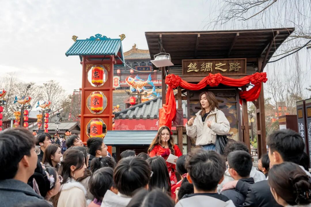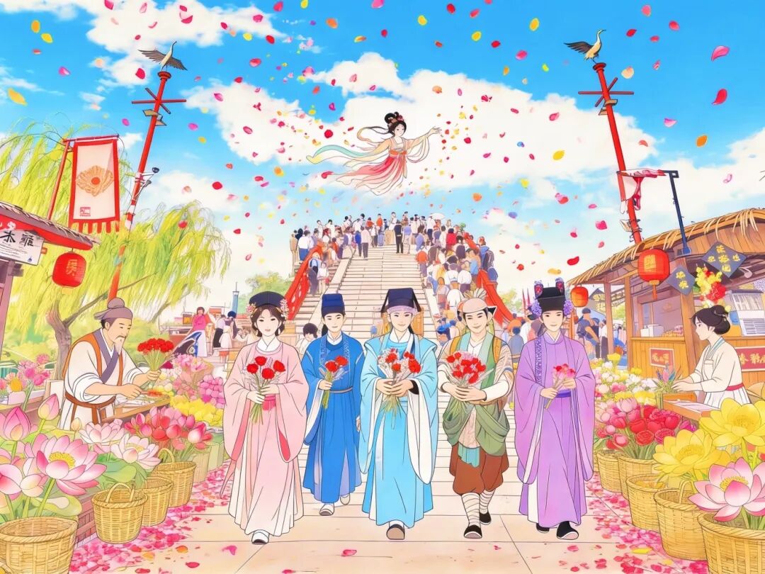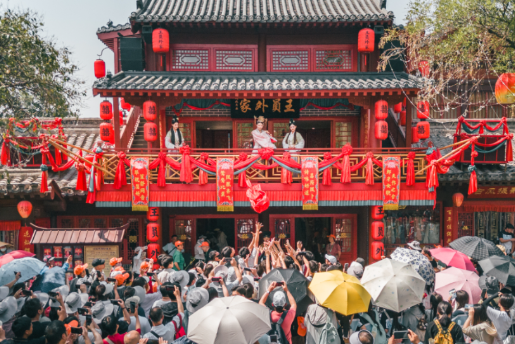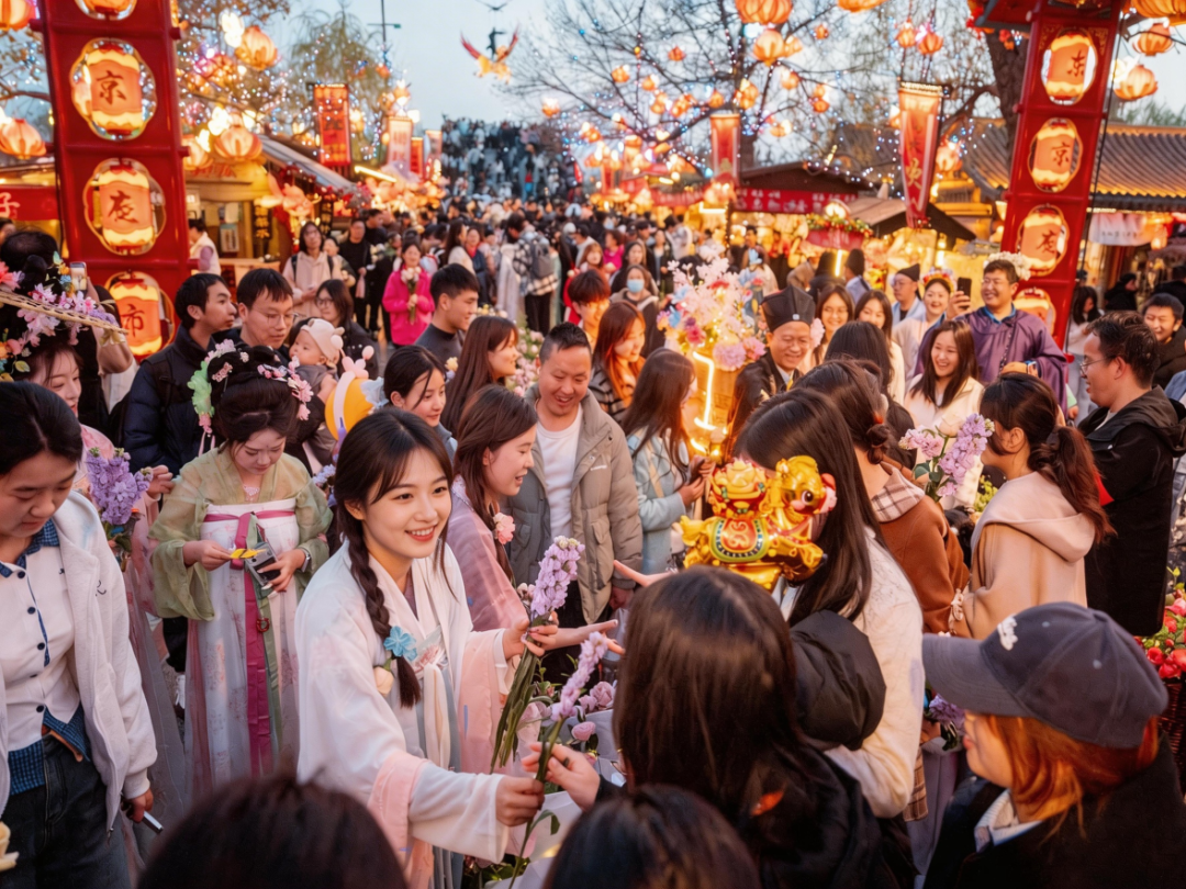 这里,满城皆是簪花人!一步一花,步步生香。更是把春日浪漫拉到顶峰!花市之上,海棠、牡丹、芍药、迎春缀满摊位,浅粉、鹅黄、淡紫交织一片,摊主身着宋装,手持花枝。不妨跟摊主互动一番,免费获得一朵鲜花,将春日温柔收入囊中~