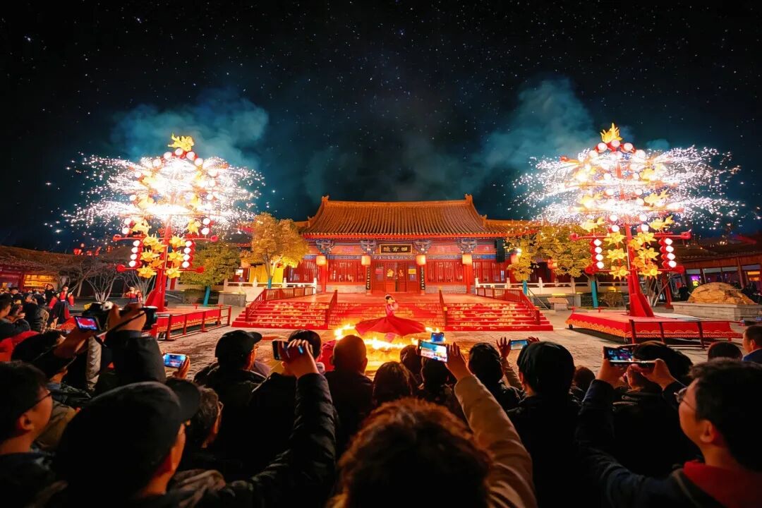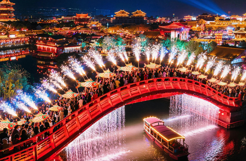 夜晚,清明上河园,化作辛弃疾笔下“一夜鱼龙舞”的梦幻盛境。百万盏花灯绵延,《鱼灯大巡游》《国风大巡游》《打铁花之盛世大宋》《凤舞九天飞天秀》《决战汴梁城》《药发傀儡·盛世焰歌》夜间好戏接连登场!