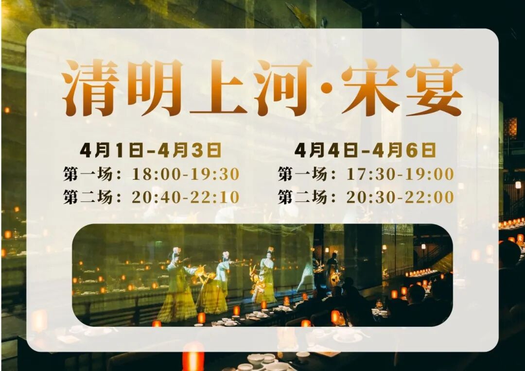 全国首个宋文化沉浸式餐秀,“雅致”与“市井”融于一席。八幕十场,移步换景;味是宋雅,亦是剧情。清明节假期,双场晚宴预约开启,共赴风雅之约!品《清明上河·宋宴》沉浸餐秀,可3日内免费无限次畅游清明上河园。一盏宋瓷盛珍馐,一曲雅乐伴佳肴。双场晚宴开席时间请查收~