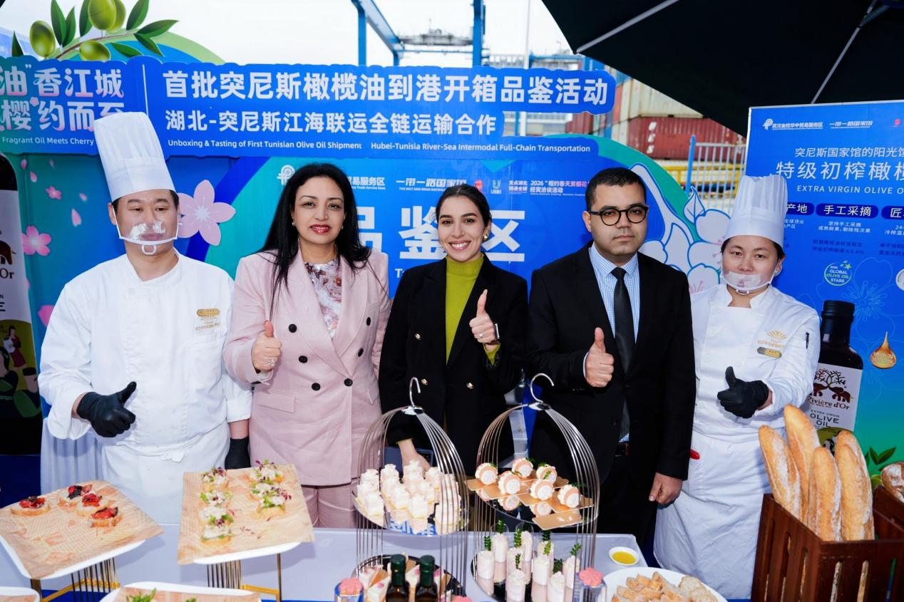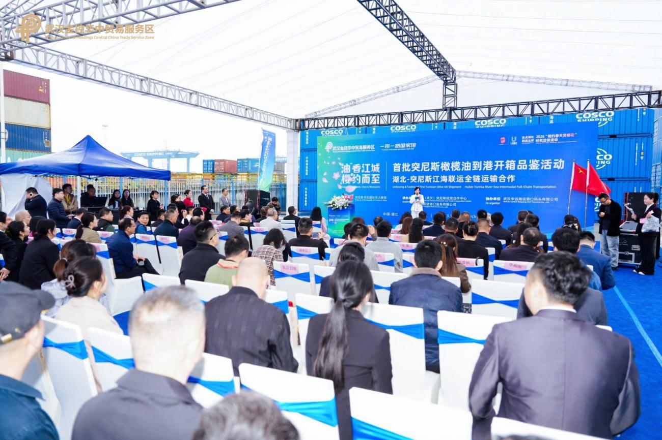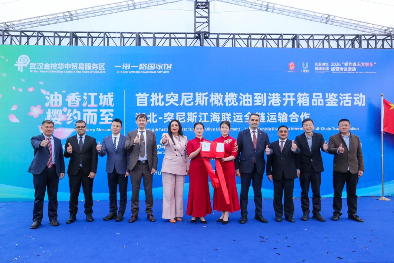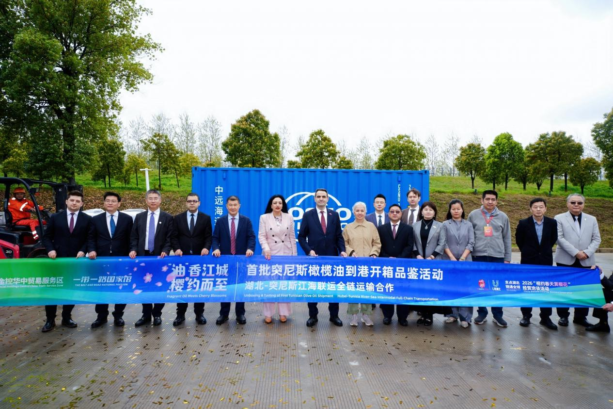 荆楚网(湖北日报网)讯(记者 徐蕾 通讯员 沈商轩)3月30日,“首批突尼斯橄榄油到港开箱品鉴活动暨湖北—突尼斯江海联运全链运输合作仪式”在武汉阳逻国际港区中远海运CSP码头成功举办。本次活动是2026“相约春天赏樱花”经贸洽谈活动的专题系列之一,以“支点湖北 链通全球”为主题,搭建全球高端资源对接平台,共促开放合作。活动由突尼斯共和国驻华大使馆主办,中国(武汉)突尼斯经贸合作中心、武汉阳逻港口服务有限公司承办,武汉中远海运港口码头有限公司协办。突尼斯、土耳其驻华使节、俄罗斯驻武汉总领事,湖北省、武汉市相关部门及企业负责人等嘉宾出席,共同见证突尼斯橄榄油首次以江海联运模式直达阳逻港,标志着鄂突经贸物流合作迈入全链条新阶段。