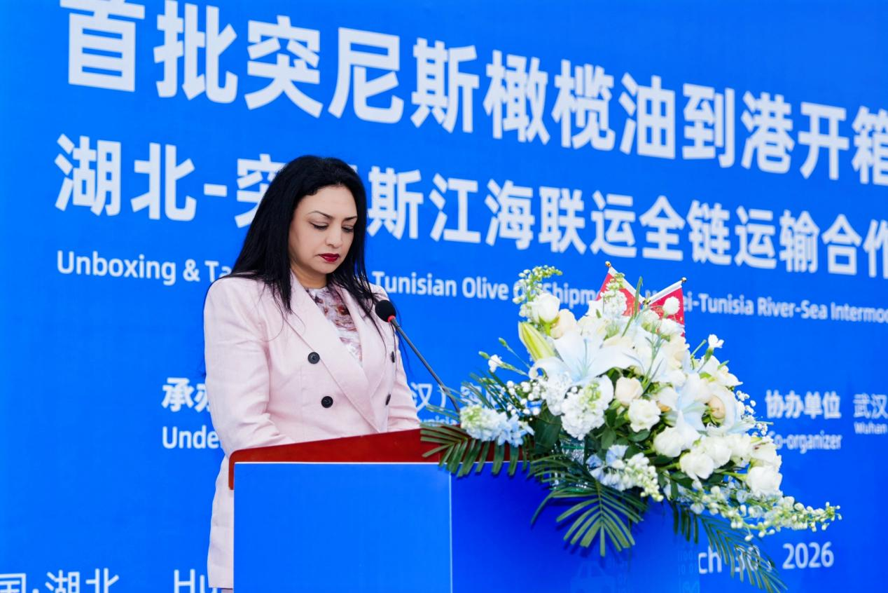 活动中,湖北省商务厅二级巡视员陈斌、突尼斯大使馆公使伊姆-阿雅迪女士、武汉阳逻港口服务有限公司总经理徐宝卫先后致辞,对深化中突经贸合作、拓展湖北对外开放新通道寄予厚望。伊姆-阿雅迪公使表示,橄榄油是突尼斯的“液体黄金”,更是连接两国友谊与经贸往来的重要纽带,此次首箱抵汉具有里程碑意义。