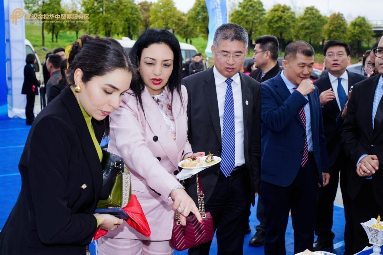 在全场瞩目下,突尼斯大使馆公使伊姆-阿雅迪女士与湖北省商务厅二级巡视员陈斌共同为首批抵港橄榄油集装箱开箱。工作人员取出样品,由礼仪人员呈送展示,现场掌声热烈。随后,土耳其驻华大使塞尔丘克・于纳尔、突尼斯驻华商务参赞阿卜杜勒哈拉克・杜卡尔,以及武汉市外办副主任李军、市商务局一级调研员马宗辉、武汉长江新区阳逻街道党工委书记申济丰、武汉阳逻港口服务有限公司总经理徐宝卫一同上台,现场品鉴突尼斯橄榄油,直观感受其纯正品质与独特果香。