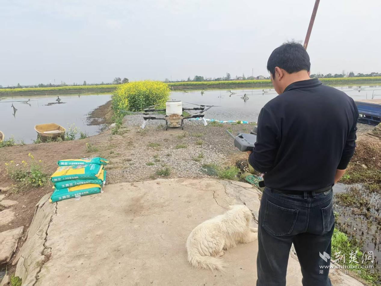 “以前,这几块田投食,两人得花费两个多小时才能完成。”周传清站在田埂边,手握遥控器,眼睛盯着空中的“小帮手”,“现在用无人机,设置好数量和路线,120亩的虾稻田,不到1个小时就全部搞定。”