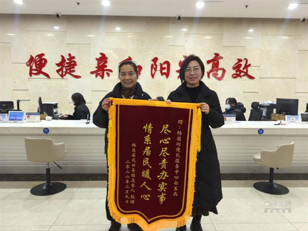 荆楚网(湖北日报网)讯(通讯员 白玉兵 侯本瑞)近日,武昌区杨园街道便民服务中心内,居民田女士成功拿到刚办好的个人资助缴费回执单,向中心工作人员送来锦旗并表示感谢。这是该中心办结的辖区首笔城乡居民养老保险个人资助缴费业务,不仅填补了相关服务空白,更以“量身定制”的贴心服务,为田女士解决养老顾虑。